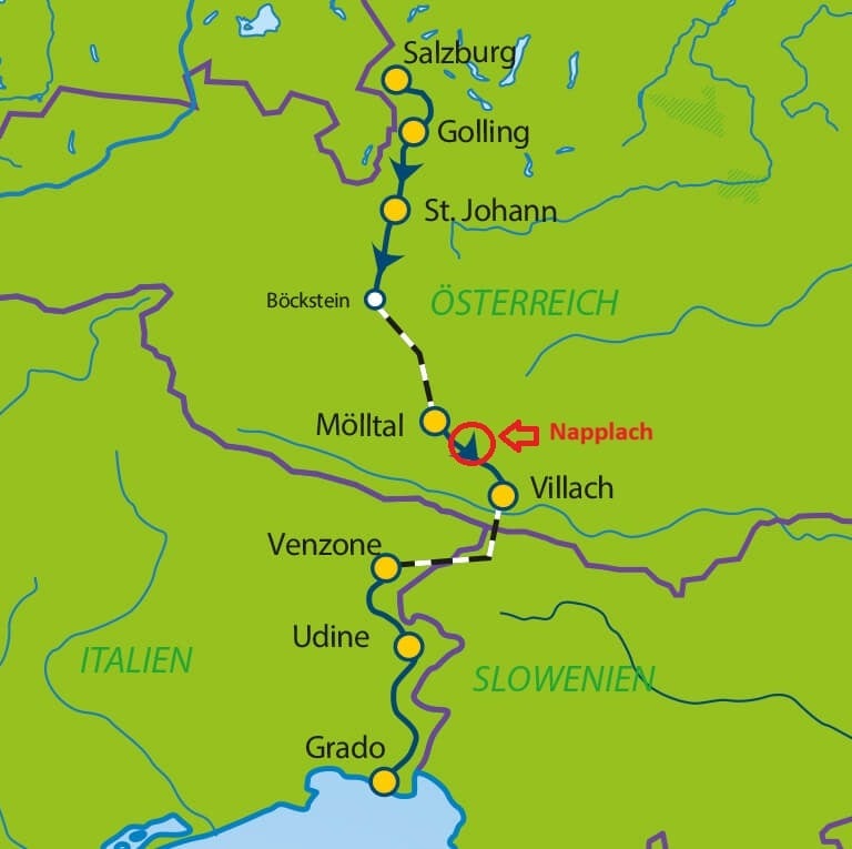 De fietsroute is erg populair, want prima te doen voor de meeste fietsers. Hoewel u veel door prachtig bergachtig gebied rijdt volgt u met name rivieren en voormalige spoorlijnen, die slechts heel geleidelijk stijgen. Als u van Salzburg (420 meter hoogte) naar Grado (zeeniveau) fietst daalt u meer dan dat u stijgt.